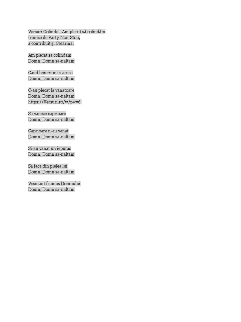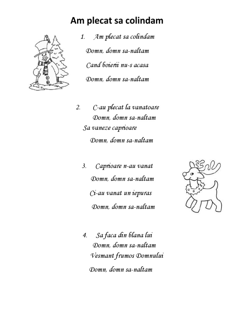 Am plecat să colindăm domn domn să nălţăm când boierii nu s acasă domn domn să nălţăm. De mii de ani se obişnuieşte ca în preajma crăciunului oamenii să se adune în cete şi să pornească colindatul. C au plecat la vânătoare să vâneze căprioare căprioare n au vânat ci au vânat un iepuraş să facă din pielea lui vesmint frumos domnului. Christmas carols am plecat să colindăm versuri.