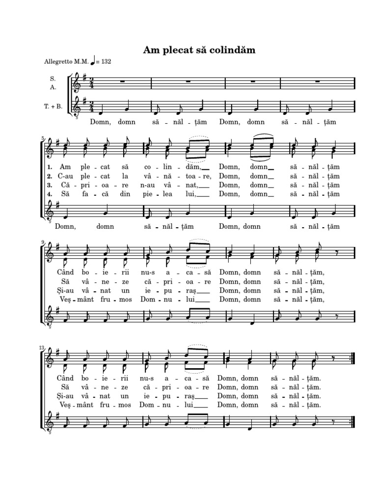 12 2014 de crăciun partituri partituri corale 0 comentarii. Versuri am plecat să colindăm de colinde. Colindul împletește teme creștine cu teme laice amintind totodată de iobăgie și de obiceiul vechi al celor cu stare de a ieși la vânătoare iarna înainte de sărbători.