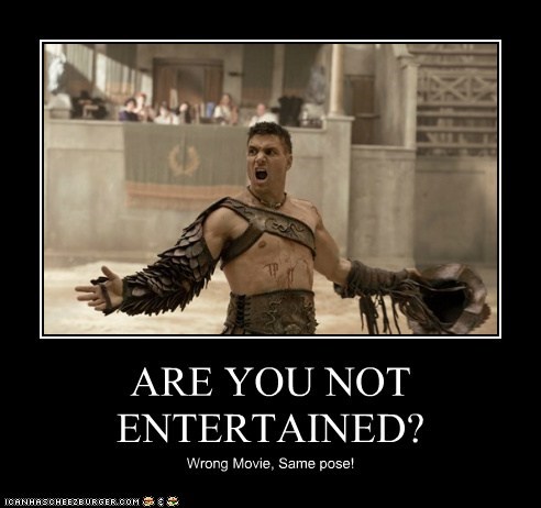 Are you not entertained is a memorable quote from the 2000 historical drama film gladiator that is used by the original poster op as a retort to lukewarm reception of his or her contribution. Part of the infamous turtlegang. It is often featured as the caption in reaction images wherein the subject is posing with outstretched arms in a similar vein to the come at me bro image macro series. Like to play spacs in my spare time.
