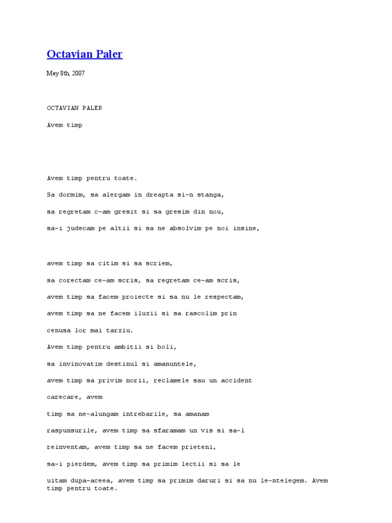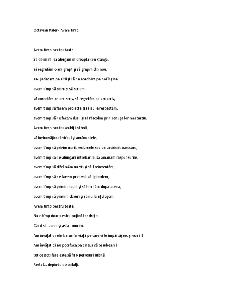 Avem timp pentru toate. Să dormim să alergăm în dreapta şi n stânga să regretăm c am greşit şi să greşim din nou sa i judecam pe alţii şi să ne absolvim pe noi înşine avem timp să citim şi să scriem să corectăm ce am scris să regretăm ce am scris avem timp să facem proiecte şi să nu le. Avem timp pentru toate. Avem timp pentru toate. Am invatat ca nu poti face pe cineva sa te iubeasca tot ce poti face este sa fii o persoana iubita.