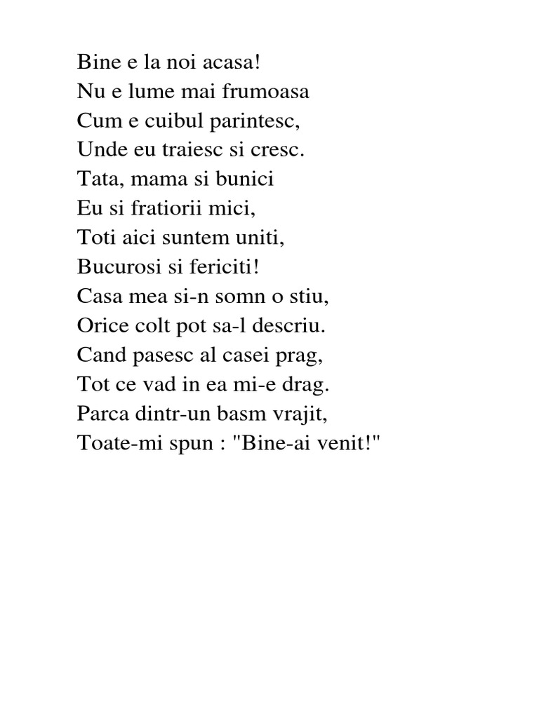 Bine e la noi acasa este o poezie mai veche pentru grupa mare si pregatitoare care incepand de azi este adaugat in categoria poezii de gradinita. Enjoy the videos and music you love upload original content and share it all with friends family and the world on youtube. Tata mama şi bunici eu şi frăţiorii mici toţi aici suntem uniţi bucuroşi şi fericiţi. Tata mama și bunici eu și frățiorii mici toți aici suntem uniți bucuroși și fericiți.